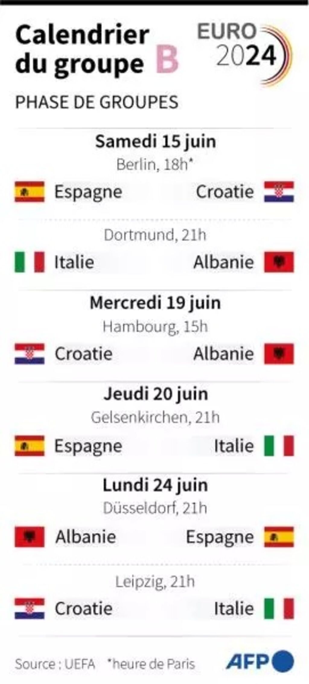 | Calendrier des matches de phase de groupes du groupe B, de l'Euro-2024 de football en Allemagne. Photo : AFP/VNA/CVN |