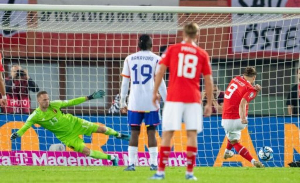 | Le milieu autrichien Marcel Sabitzer prend le gardien de la Belgique Matz Sels à contrepied sur penalty à Vienne, le 13 octobre. |