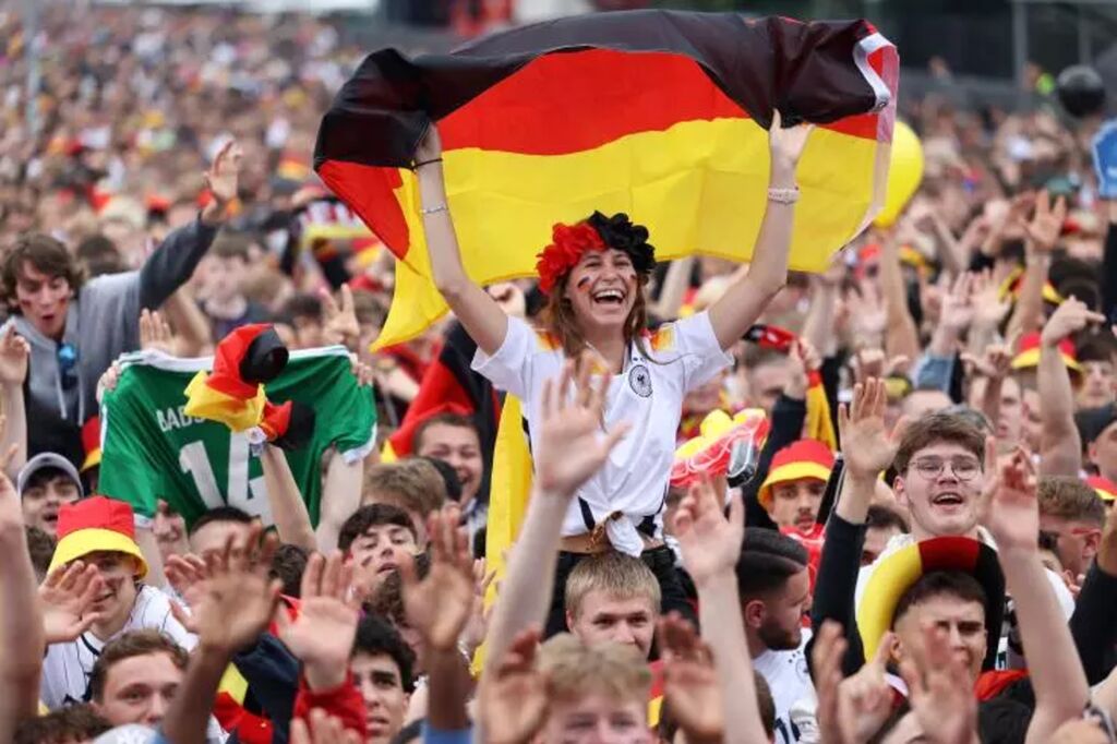 | Des fans allemands devant un grand écran à Berlin célèbrent la qualification de leur équipe pour les 8es de finale de l'Euro-2024, mercredi 19 juin. |