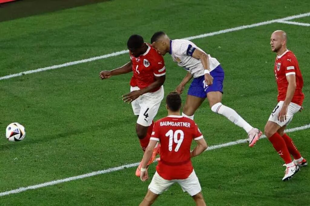 | Le capitaine de l'équipe de France Kylian Mbappe (en blanc) dans un choc nez contre épaule avec le défenseur autrichien Kevin Danso, lors de la victoire des Bleus 1-0 dans leur match de l'Euro-2024, lundi 17 juin dans la Dusseldorf Arena de Dusseldorf. |