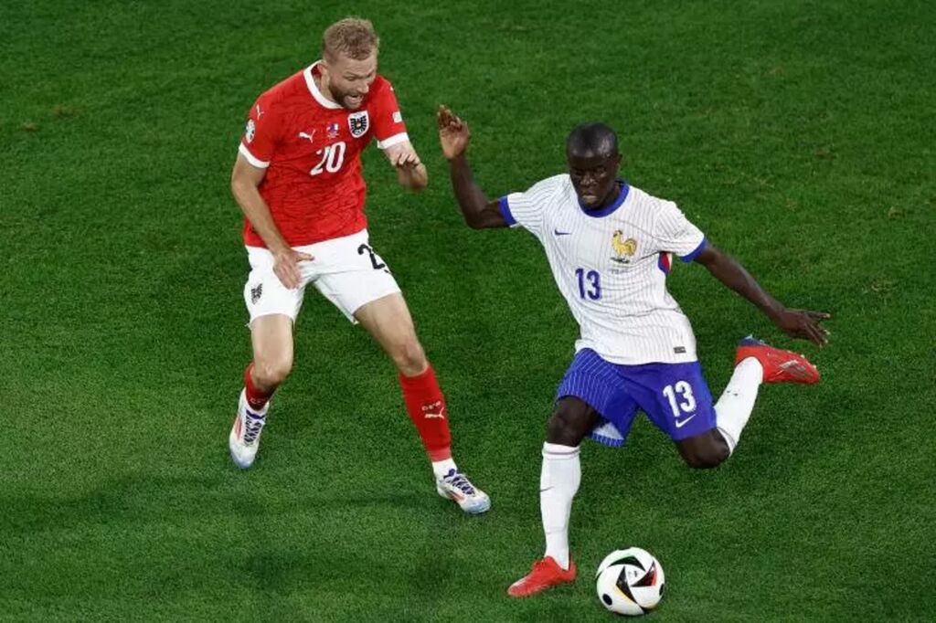 | Le milieu de terrain de l'équipe de France N'Golo Kante (No13) tente une passe face au joueur autrichien Konrad Laimer, lors du match remporté par les Bleus (1-0) dans le groupe D de l'Euro-2024, à la Dusseldorf Arena de Dusseldorf le 17 juin. |
