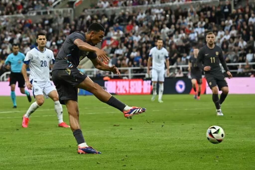 | Trent Alexander-Arnold inscrit d'une volée parfaite le 2e but de l'Angleterre contre la Bosnie-Herzégovine à Newcastle, le 3 juin. |