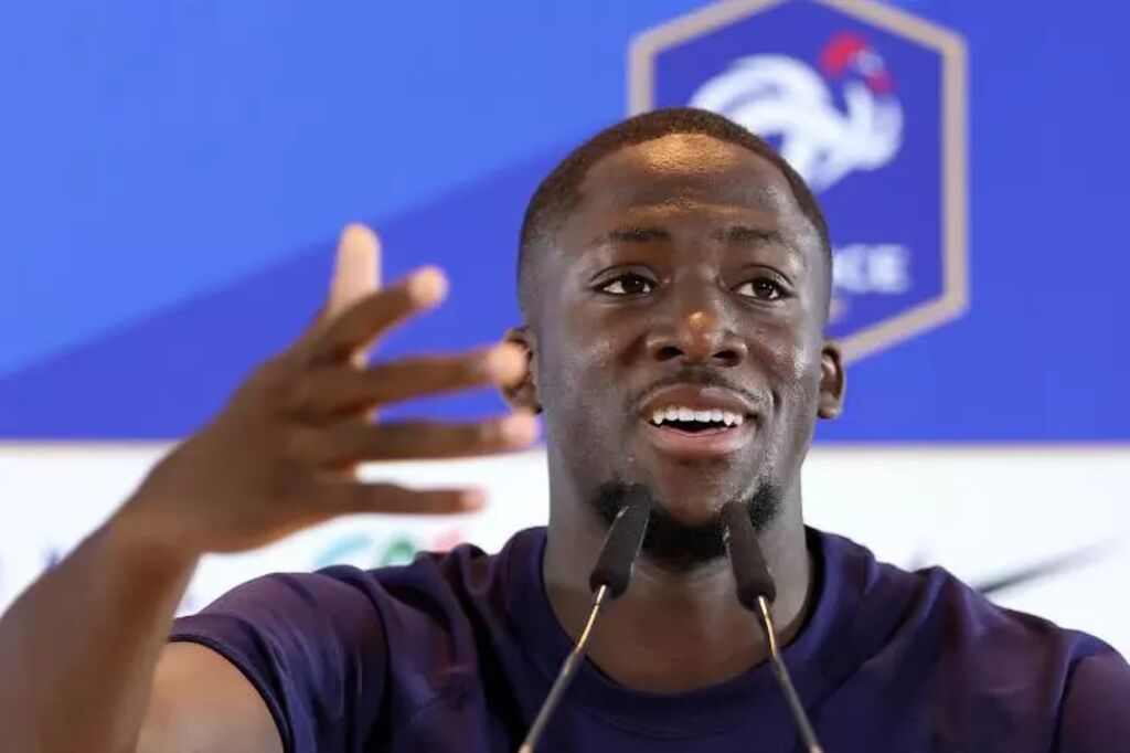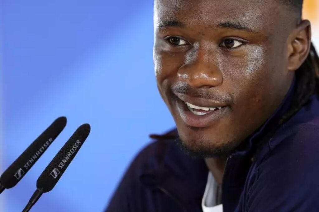 | Le défenseur de l'équipe de France de football Ibrahima Konaté, lors d'une conférence de presse avant le huitième de finale de l'Euro-2024 face à la Belgique, le 29 juin à Paderborn (Allemagne). |