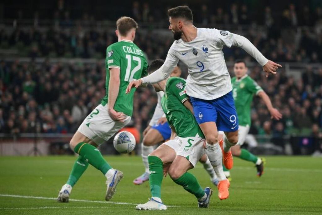| Olivier Giroud peu en vue avec l'équipe de France contre l'Irlande à Dublin, le 27 mars. |