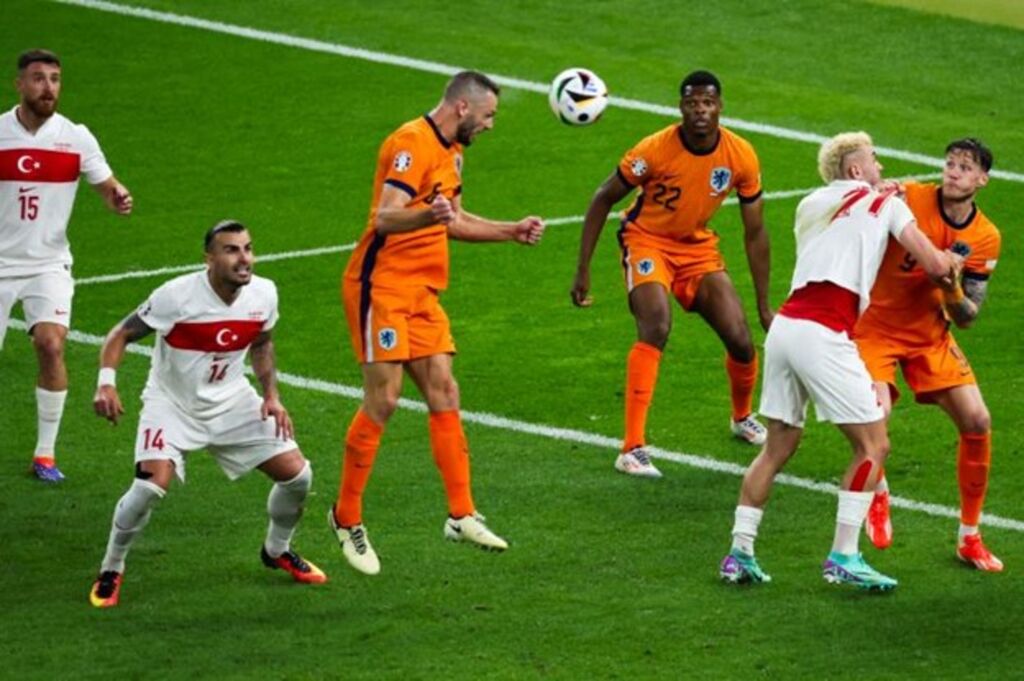 | Le Néerlandais Stefan de Vrij (centre) égalise de la tête contre la Turquie en quart de finale de l'Euro, le 6 juillet à Berlin |