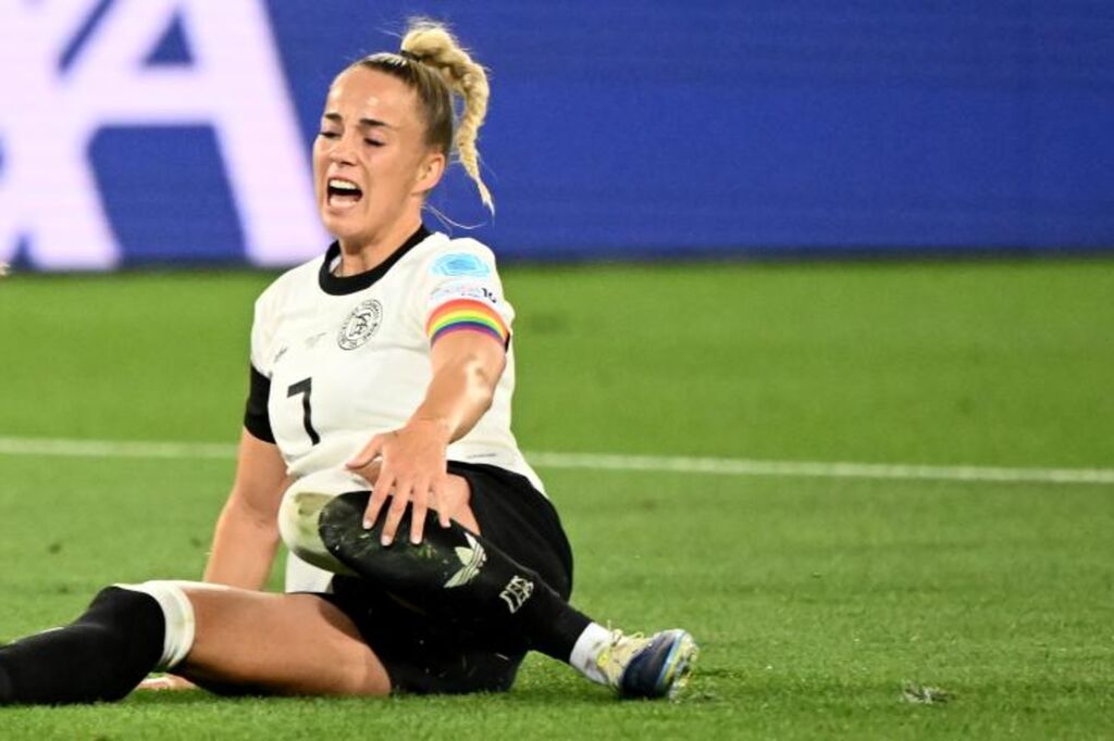 | La capitaine de l'Allemagne, Giulia Gwinn, blessée contre la Pologne à l'Euro à Saint-Gall, le 4 juillet 2025. |