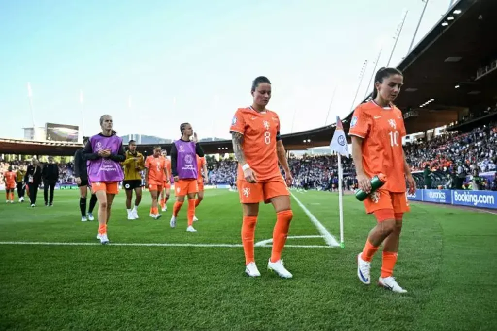 | Sherida Spitse (N.8) et Danielle van de Donk (N.10) quittent la pelouse du Letzigrund Stadium après la lourde défaite des Pays-Bas face à l'Angleterre (4-0) lors du deuxième match de poule de l'Euro-2025 de football le 9 juillet 2025 à Zurich. |