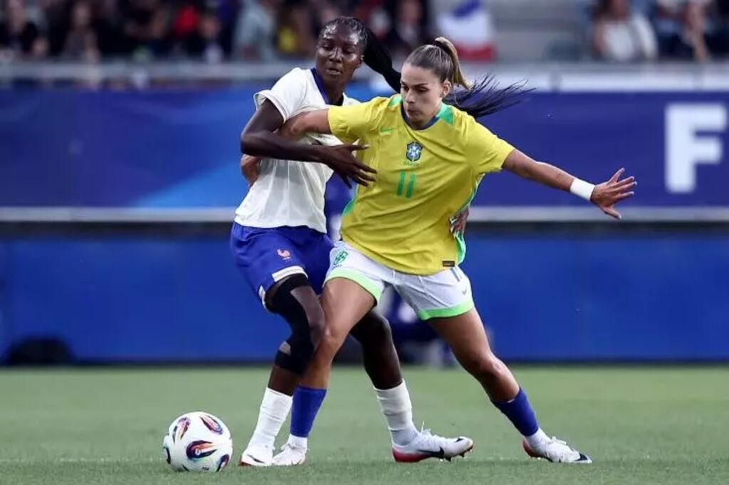 | Thiniba Samoura (gauche) face à la Brésilienne Gio lors de l'amical entre la France et le Brésil au Stade des Alpes de Grenoble le 27 juin en France. |