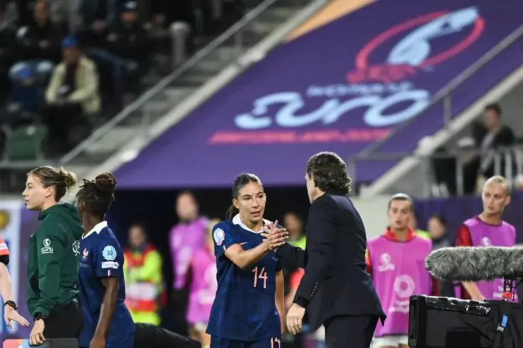 | Clara Mateo félicitée par le sélectionneur des Bleus Laurent Bonadei, lors de son remplacement contre les Galloises, le 9 juillet à Saint-Gall. |