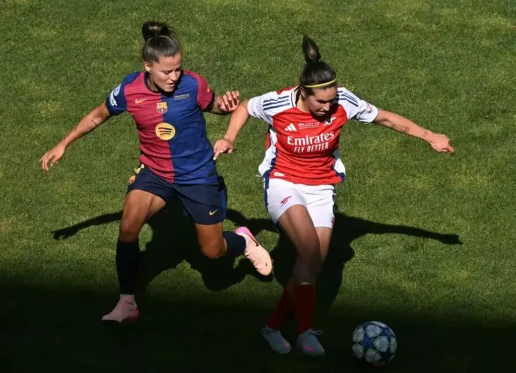 | La milieu d'Arsenal Mariona Caldentey (gauche) au duel avec la Barcelonnaise Claudia Pina, lors de la finale de la Ligue des champions féminine, à Lisbonne, le 24 mai. |