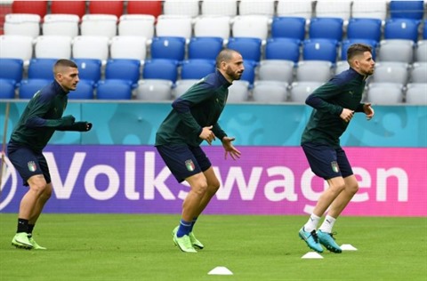 | Les footballeurs italiens Marco Verratti (gauche), Leonardo Bonucci (centre) et Jorginho lors d'une séance d'entraînement au stade Allianz Arena de Munich (Allemagne) le 1er juillet. |