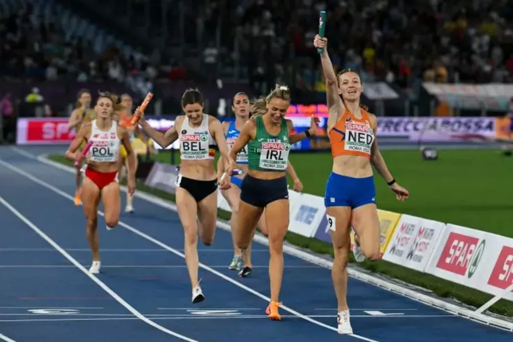Dernière relayeuse, Femke Bol a pris le témoin largement en tête avant de gérer son effort tout au long du tour de piste même si ses concurrentes revenaient sur elle. Elle a coupé la ligne après 3 min 22 sec 39 de course devant les Irlandaises (3 min 22 sec 71, record d'Irlande) et les Belges (3 min 22 sec 77).