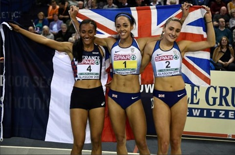 | Nadama (gauche) et les vainqueuses de pentathlon de l'Euro d'athlétisme en salle à Glasgow, le 1er mars 2019. |