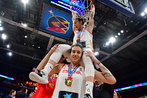 | Les Espagnoles Silvia Dominguez et Laura Nicholls après la victoire sur les Françaises en finale de l'Euro à Belgrade le 7 juillet. |