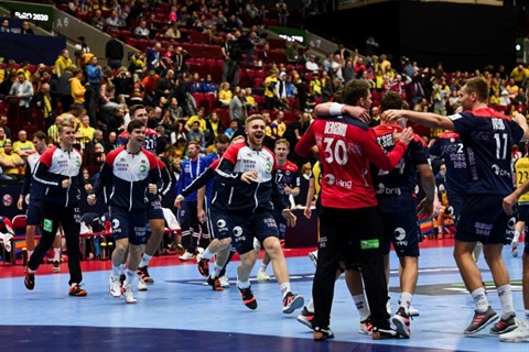 | La joie des Norvégiens après leur succès face à la Suède à l'Euro de handball, le 19 janvier à Malmö. |