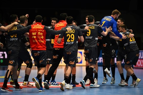 | Les Espagnols euphoriques après leur victoire sur le Belarus à l'Euro de hand, le 20 janvier à Vienne. |