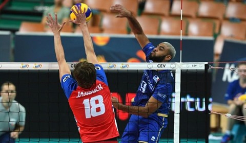 | Le Français Earvin Ngapeth (bleu) face au Tchèque Jakub Janouch en barrages de l'Euro de volley, le 30 août à Katowice. |