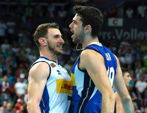 | L'Italie de Fabio Balaso et Daniele Lavia sur le toit de l'Europe, après leur victoire sur la Slovénie à Katowice, le 19 septembre. |