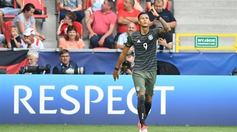 | L'espoir allemand Davie Selke a ouvert le score de la tête contre l'Angleterre, le 27 juin à Tychy, en Pologne. |