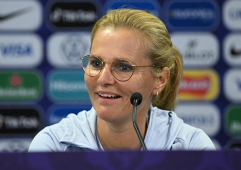 | La coach néerlandaise, Sarina Wiegman en conférence de presse à Manchester le 5 juillet. |