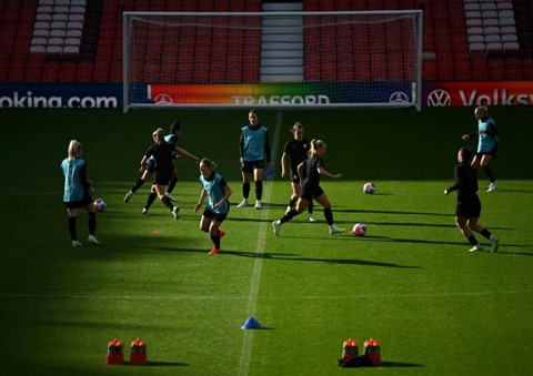 | Les Anglaises à l'entraînement le 5 juillet au stade d'Old Trafford, à Manchester, où elles affronteront mercredi 6 juillet l'Autriche en ouverture du 13e Championnat d'Europe féminin des nations. |