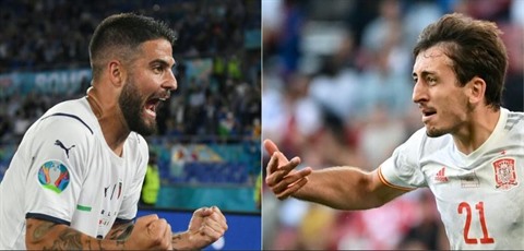 | L'attaquant italien Lorenzo Insigne (gauche), à Rome, le 11 juin, et l'attaquant espagnol Mikel Oiarzaba, à Copenhague, le 28 juin. |