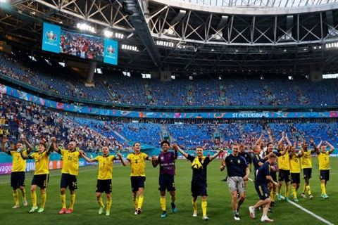 | Les Suédois saluent leurs supporters après leur victoire contre la Pologne lors du match de groupes de l'Euro, à Saint-Pétersbourg, le 23 juin. |
