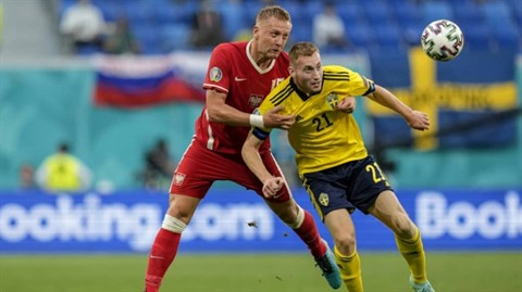 | Le milieu suédois Dejan Kulusevski (droite) aux prises avec le défenseur polonais Kamil Glik lors du match de groupes de l'Euro, à Saint-Pétersbourg, le 23 juin. |
