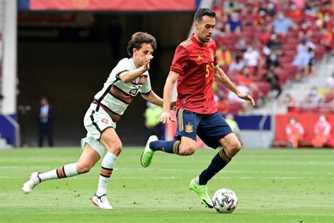 Le milieu et capitaine espagnol, Sergio Busquets (droite), lors du match amical contre le Portugal, à Madrid, le 4 juin. Photo : AFP/VNA/CVN |