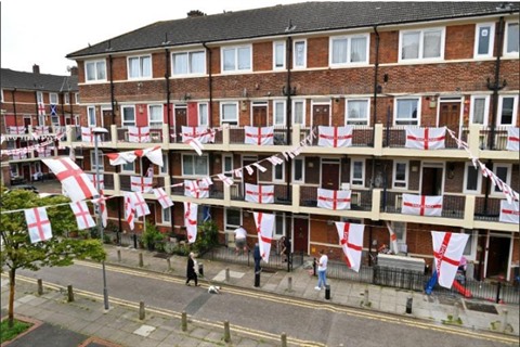 | Les façades d'une résidence de Bermondsey, dans le sud de Londres, sont décorées avec des drapeaux d'Angleterre, le 10 juillet, à la veille de la finale de l'Euro 2020 entre l'Angleterre et l'Italie. |