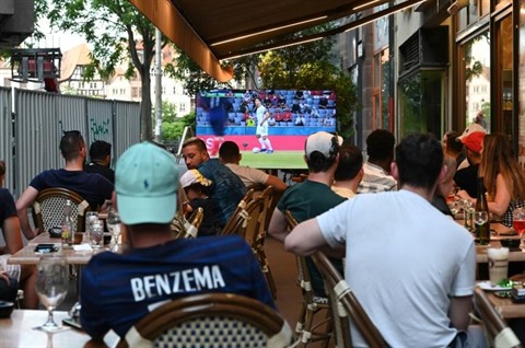 | Des spectateurs regardent France - Allemagne depuis une terrasse à Strasbourg, le 15 juin. |