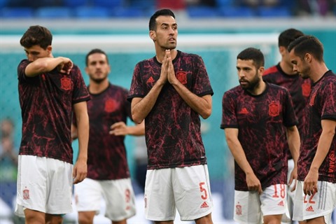 | Le milieu de terrain espagnol Sergio Busquets (centre) avant un match contre la Suisse à Saint-Pétersbourg (Russie) le 2 juillet. |