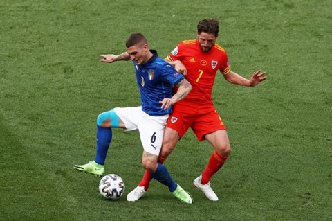 | Le meneur de jeu italien Marco Verratti (gauche) à la lutte avec le Gallois Joe Allen, à l'Euro, le 20 juin à Rome. |