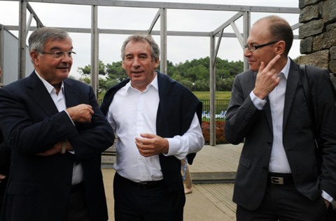 | De gauche à droite : Michel Mercier, François Bayrou et le président de l'Union syndicale des magistrats Christophe Regnard, à Guidel (Morbihan), le 29 septembre 2013. |