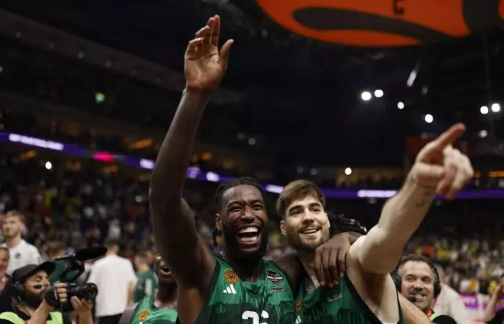 | Le pivot français Mathias Lessort (gauche) et l'ailier espagnol Juancho Hernangomez fêtent leur qualification avec le Panathinaikos pour la finale de l'Euroligue, le 24 mai 2024 à Berlin. |