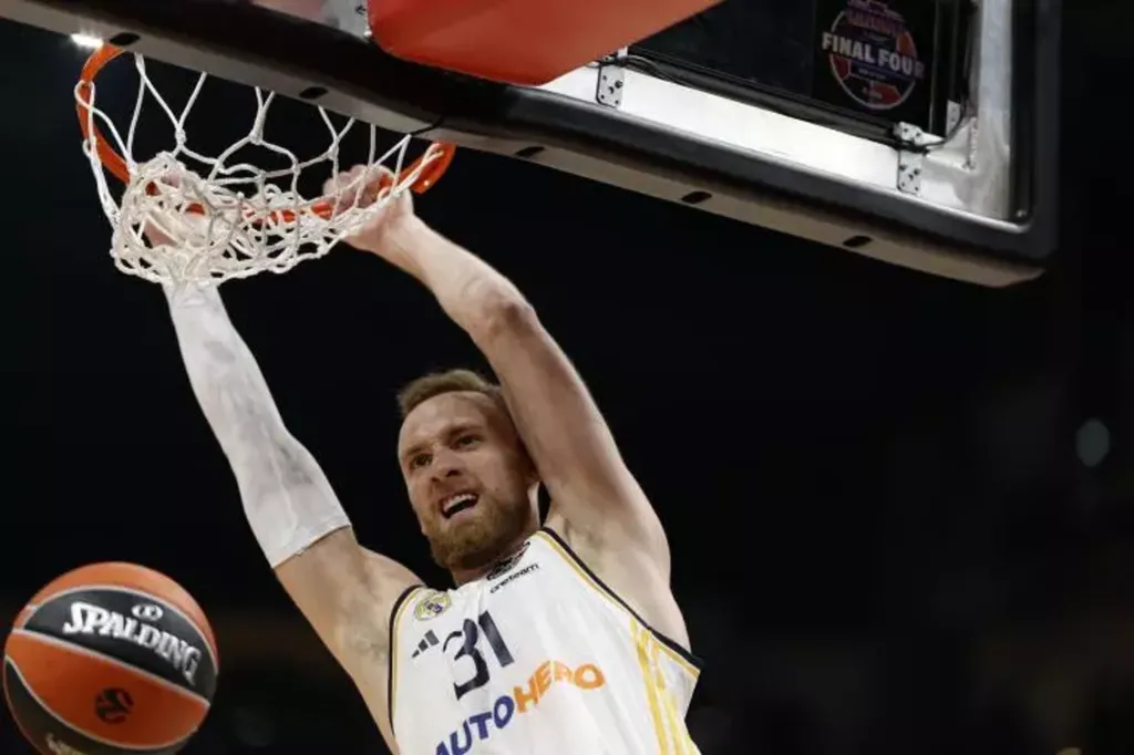 | L'ailier du Real Madrid, Dzanan Musa, au dunk contre l'Olympiakos en Euroligue, le 24 mai 2024 à Berlin. |
