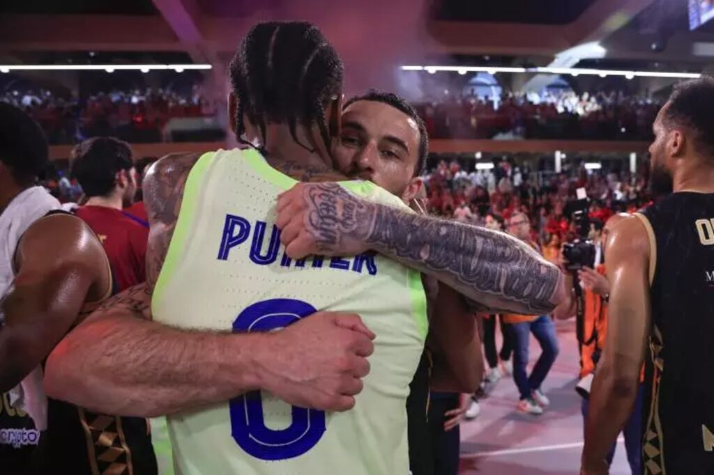 | L'accolade entre le meneur de Monaco, Mike James, et celui de Kevin Punter à l'issue du succès monégasque en Euroligue, le 6 mai. |