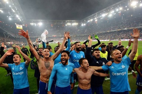 | Les Marseillais en liesse à l'issue de leur qualification pour la finale de l'Europa League, malgré leur défaite à Salzburg, le 3 mai. |