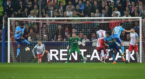| Le défenseur marseillais Rolando (gauche) marque le but de la qualification de l'OM pour la finale de l'Europa League, le 3 mai à Salzburg. |