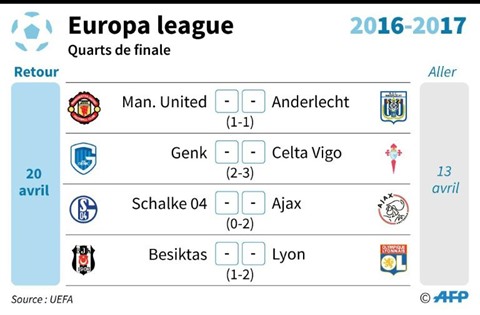 Les deux derniers quarts de finale retour opposeront les Allemands de Schalke à l'Ajax Amsterdam, qui les a corrigés à l'aller (2-0) avec un effectif très jeune, et le club belge de Genk au Celta Vigo. Les Espagnols s'étaient imposés 3-2 à domicile lors de la manche aller.