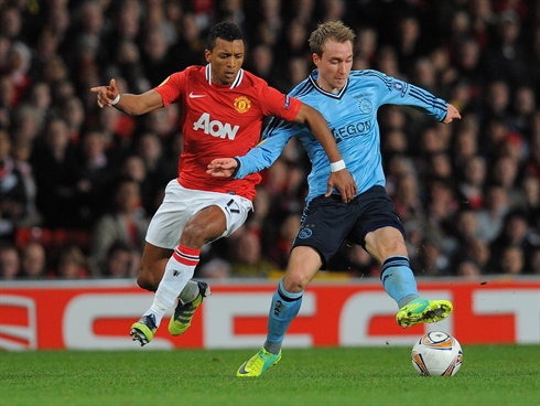 | Christian Eriksen (droite) d’Ajax à la lutte contre Nani de Manchester United, le 23 février à Old Trafford. |