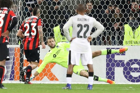 | L'attaquant de Nice Alexy Bosetti (N°23) inscrit un but sur penalty face à Krasnodar en Europa League à l'Allianz Riviera, le 8 décembre |