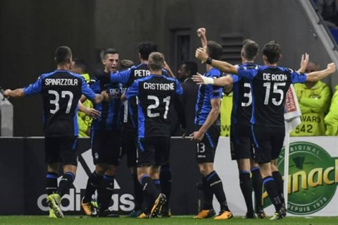 | Les joueurs de l'Atalanta fêtent le but égalisateur de Papu Gomez face à l'OL, le 28 septembre à Lyon. |