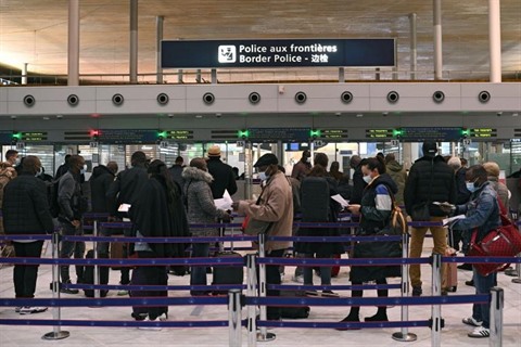 | Des voyageurs préparent les documents à présenter au contrôle aux frontières à l'aéroport de Roissy Charles-de-Gaulle, le 1er février. |