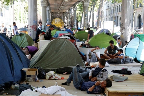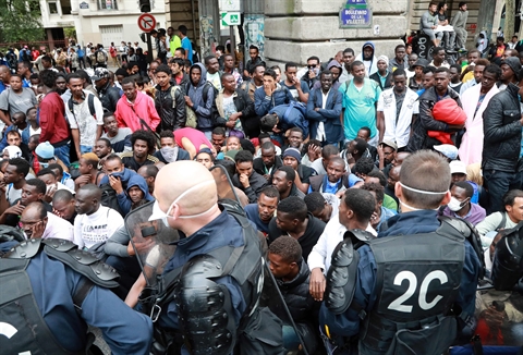 La foule s'était installée progressivement sur le terre-plein central envahi par des centaines de tentes et de matelas, au milieu des détritus et des flaques d'urine. À quelques mètres se trouvent des locaux de France terre d'asile, où les migrants font leur première demande d'enregistrement.