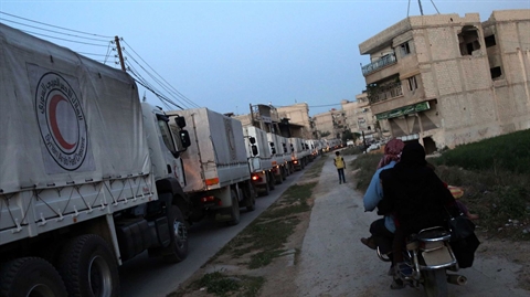 | Les camions d'aide humanitaire du Croissant-Rouge syrien arrivent à Saqba, le 19 avril 2016. |