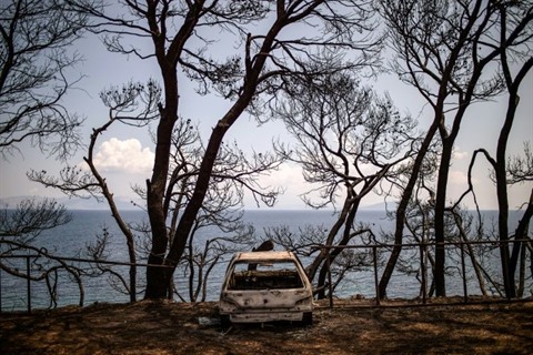 | Une voiture brûlée à Mati, près d'Athènes après les incendies, le 28 juillet. |