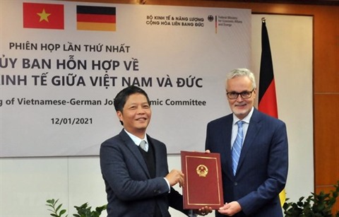 | Le ministre vietnamien de l'Industrie et du Commerce, Trân Tuân Anh (gauche), et l'ambassadeur d'Allemagne au Vietnam, Guido Hildner, signent un procès-verbal, le 12 janvier à Hanoï. |