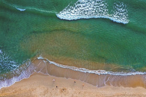 | Vue aérienne du bord de mer écumeux de la plage My Khê à Dà Nang (Centre). |