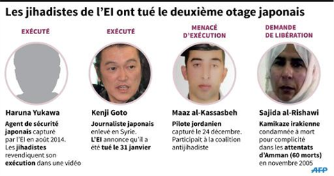 Outre les deux Japonais, l'EI a revendiqué depuis la mi-août l'exécution de cinq otages occidentaux. Il s'agit des deux journalistes américains James Foley et Steven Sotloff, ainsi que d'un troisième Américain, le travailleur humanitaire Peter Kassig, et de deux Britanniques, travaillant également dans l'humanitaire, David Haines et Alan Henning, tous enlevés en Syrie.